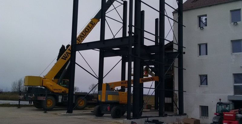 Waltefaugle construit actuellement une extension de 17.60 m x 7.00 m contre un bâtiment existant, à Bannans dans le Doubs.2 poteaux de 2 tonnes chacun...
