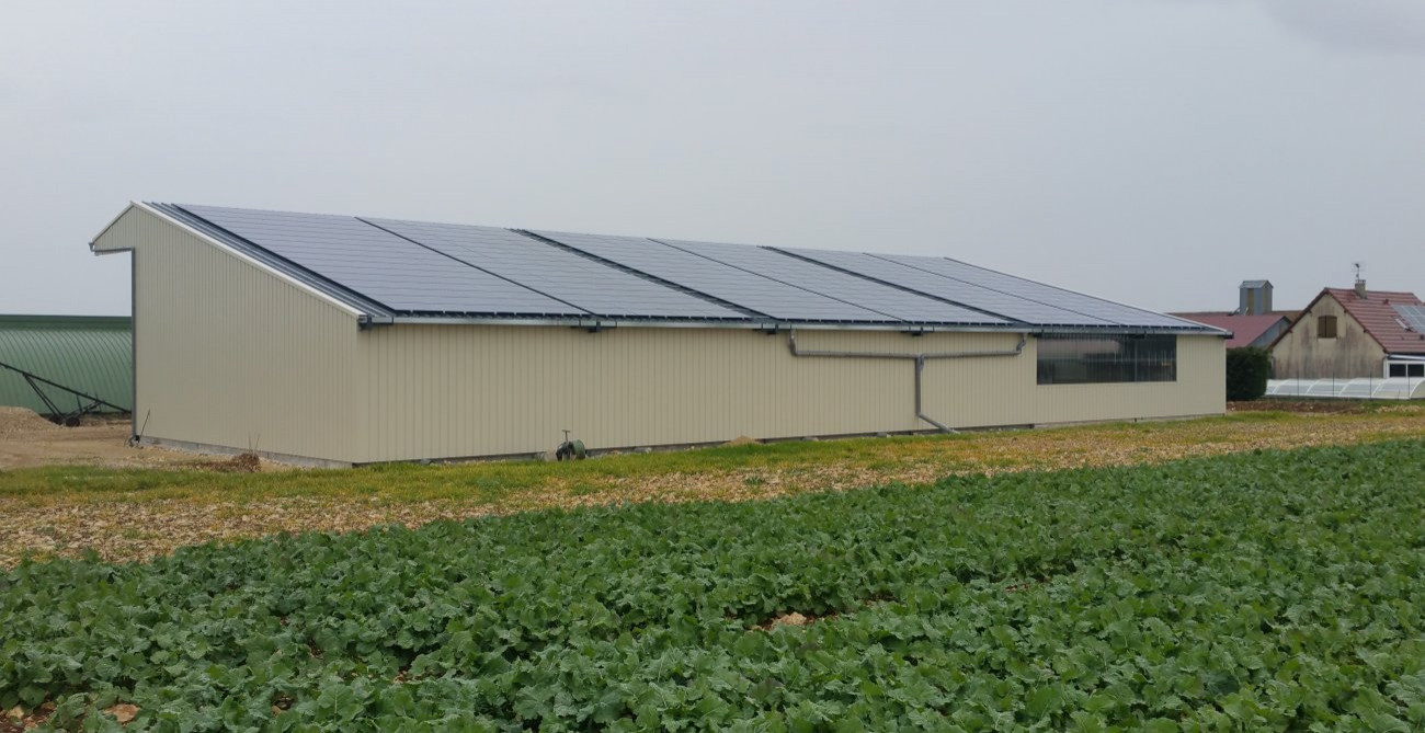 Nous sommes les premiers charpentiers à avoir construit un bâtiment agricole avec une toiture intégralement couverte de panneaux photovoltaïques en Alsace.