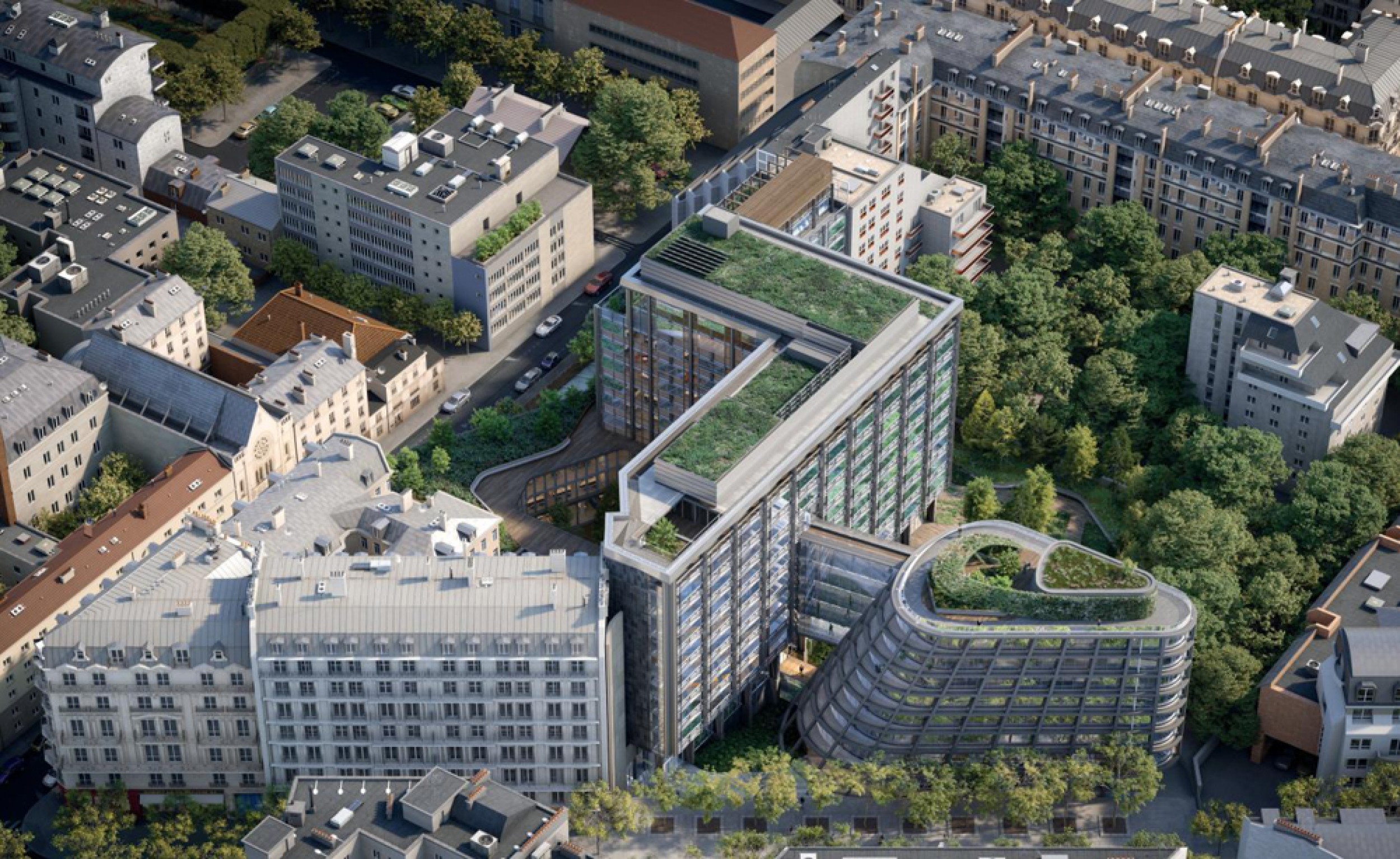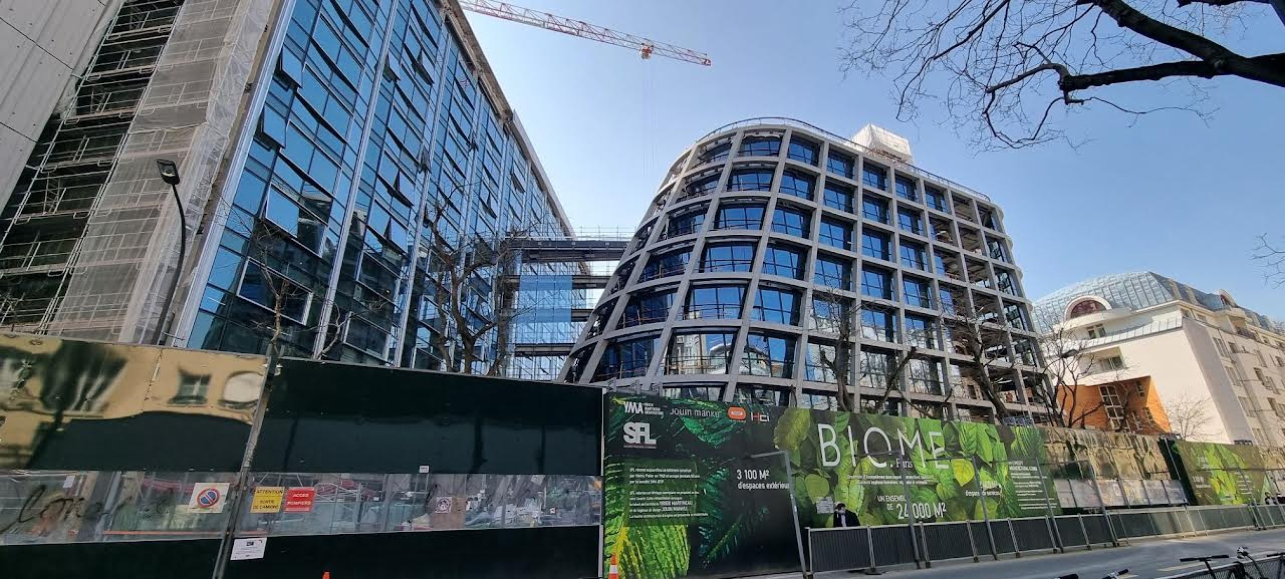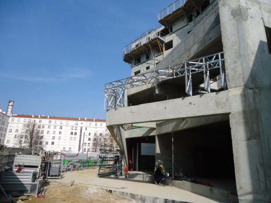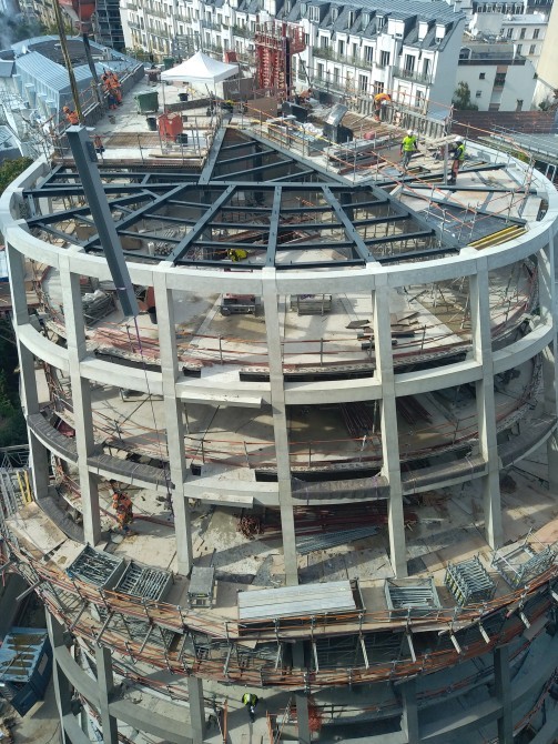 840 T d'acier en plein coeur de Paris dans un site exigu, avec le renforcement d'un bâtiment IGH de 11 étages, la ré-hausse de 3 étages d'un autre bâtiment et la construction d'un dernier bâtiment en forme de goutte d'eau / construction mixte acier / béton
