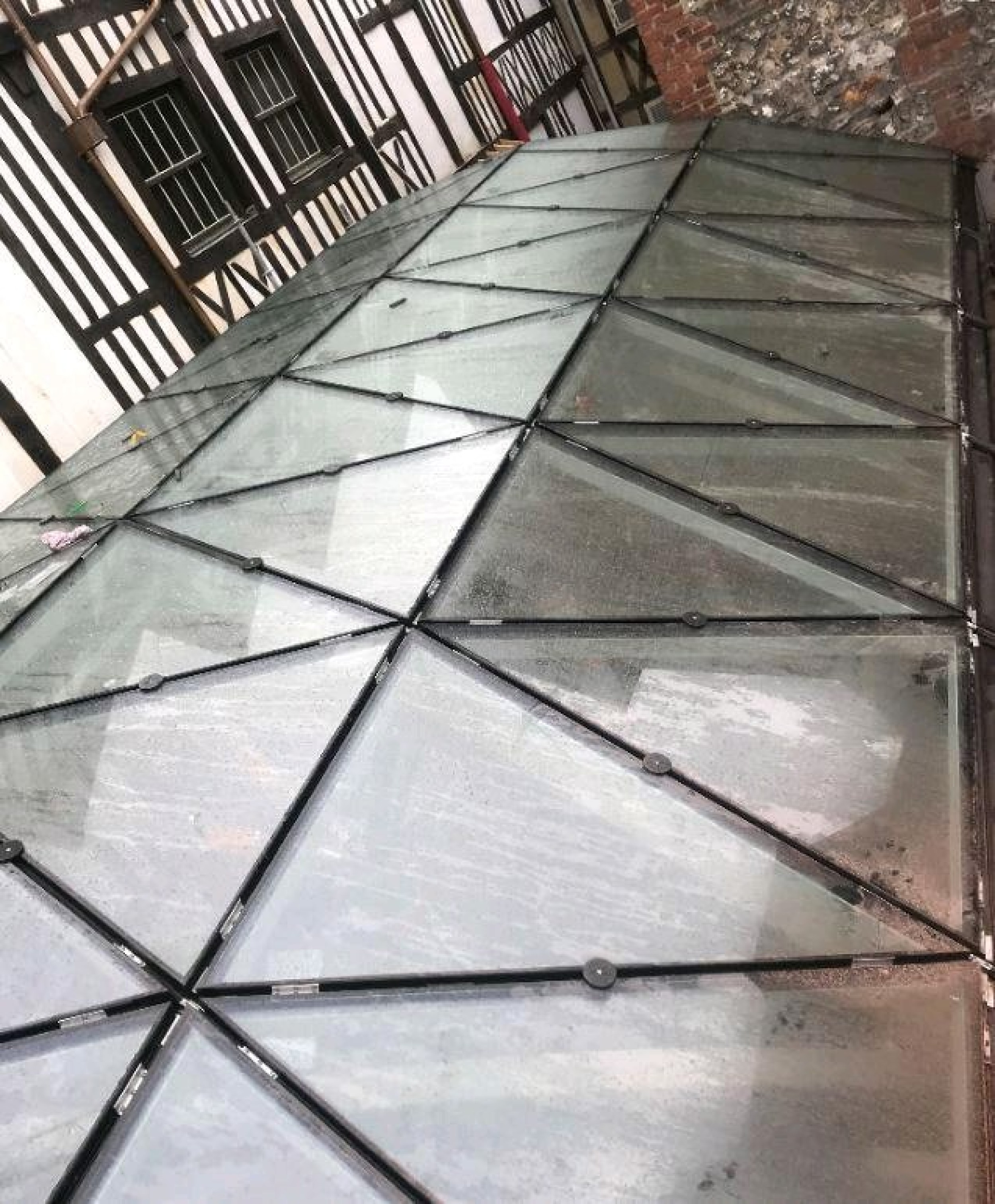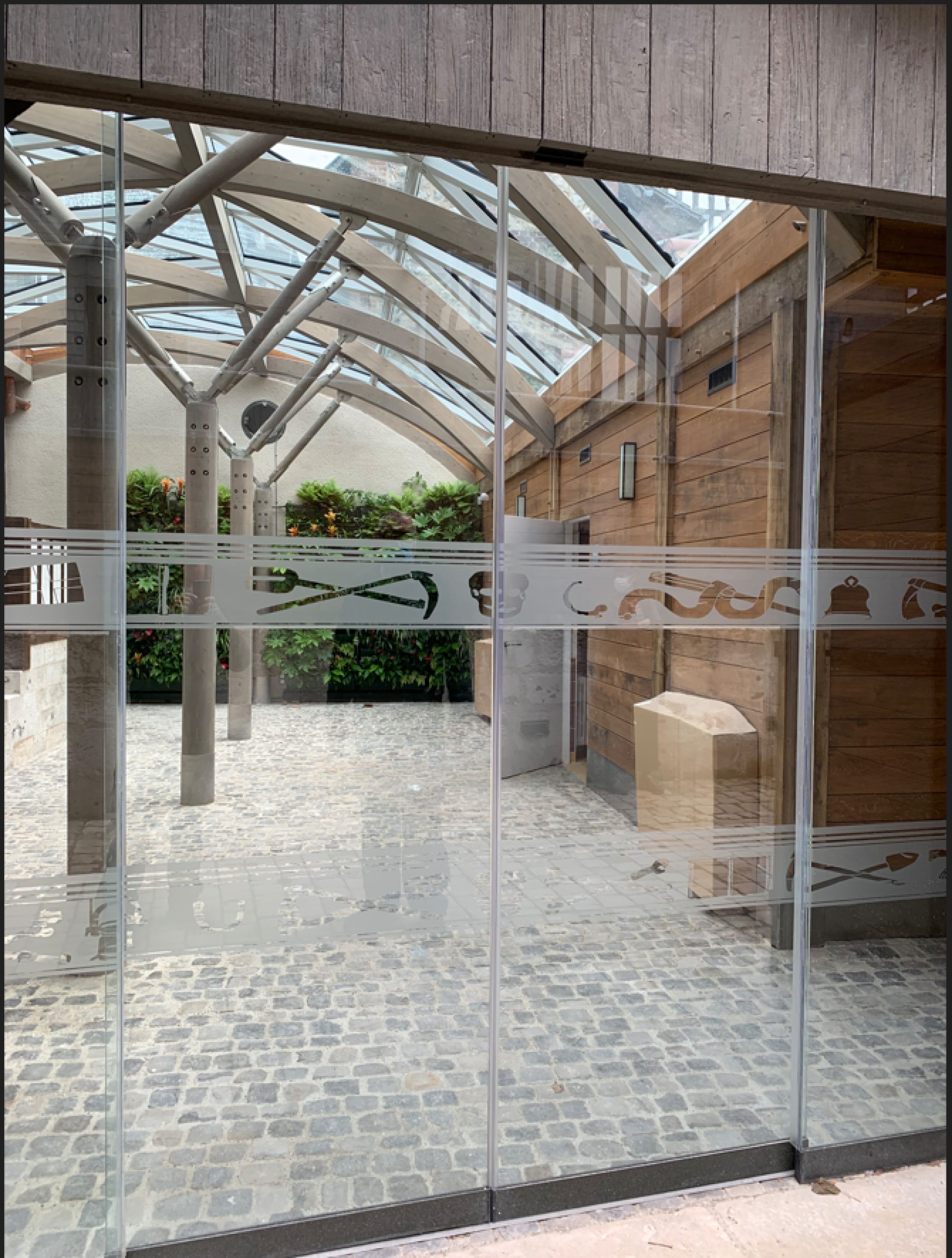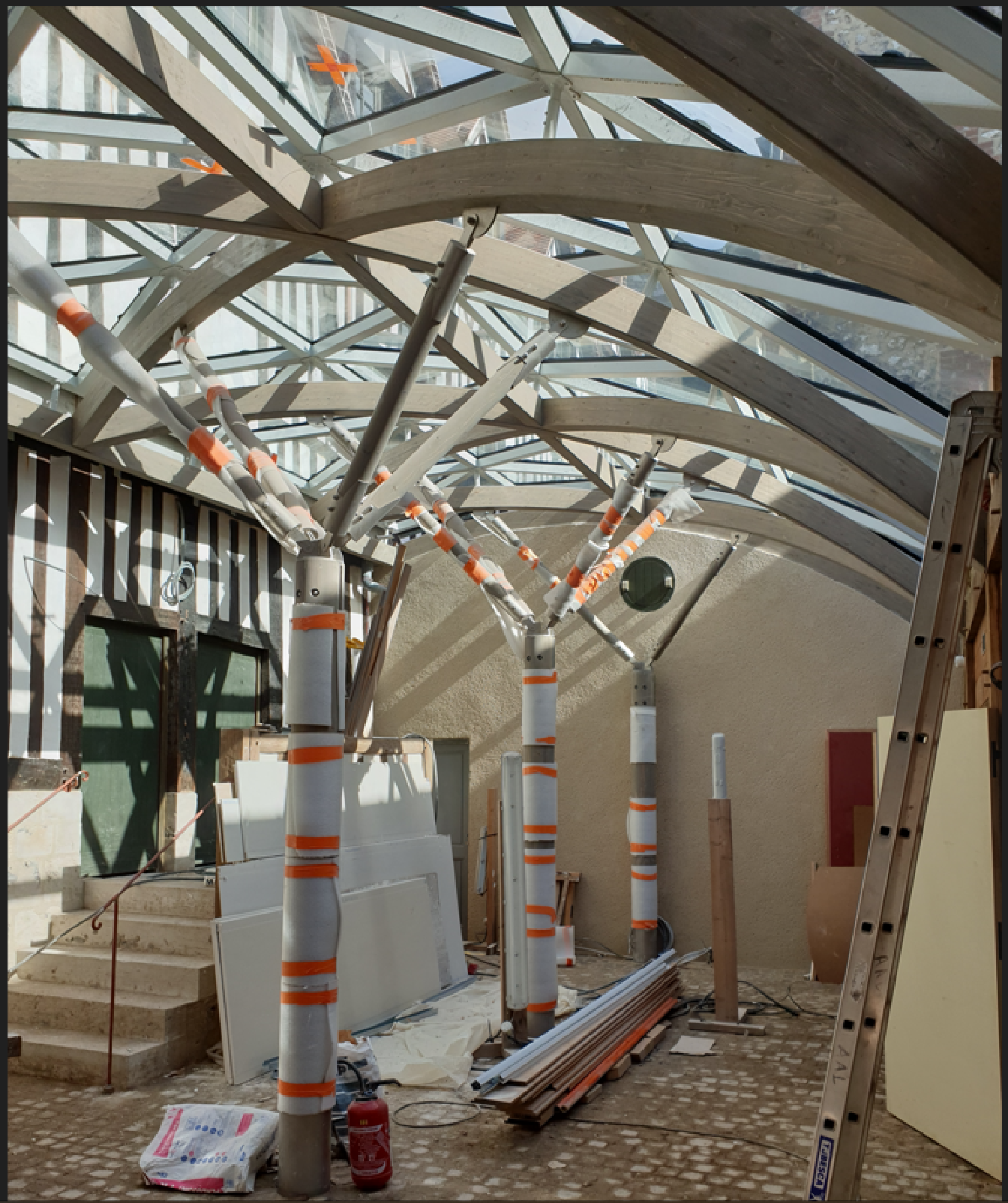 Réhabilitation. Construction d'une verrière en lamellé collé cintré sur un site classé monument historique. Fleuron du patrimoine de la Région Normandie, l’Aître de Saint Maclou est un ancien cimetière cloître-charnier du XVIè siècle. L’intervention a été réalisée en site restreint dans une cour intérieure existante.